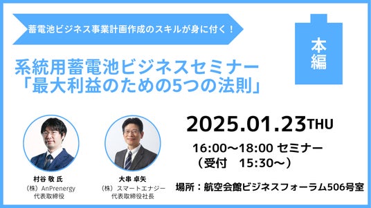 太陽光発電所の運営・保守事業において国内最大手(※)の株式会社スマートエナジー(東京都港区 代表取締役 大串卓矢、以下スマートエナジー)は株式会社AnPrenergy(東京都港区 代表取締役 村谷 敬、以下AnPrenergy)との共催で、『系統用蓄電池ビジネスセミナー 「最大利益のための5つの法則」』を2024年5月より開催しています。