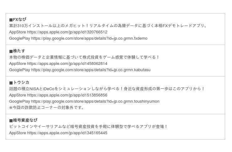 ゲーム感覚で投資を学べるデモトレードアプリ内で啓発と注意喚起を呼びかけ