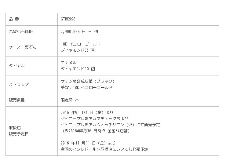 セイコーウオッチ株式会社(代表取締役社長 兼 CEO:服部 真二、本社:東京都中央区)は、セイコー創業135 周年を記念して、高級ウオッチブランド<クレドール>から、クレドールを代表する国産最薄のメカニカルムーブメント「キャリバー68 系」(※1)を搭載した「キャリバー6898 20 周年記念 エナメルダイヤル限定モデル」を、2016 年9 月23 日(金)よりセイコープレミアムブティックとセイコープレミアムウオッチサロンにて、11 月11 日(金)より全国の<クレドール>取扱店にて、発売いたします。希望小売価格は2,900,000円+税、数量限定30本です。