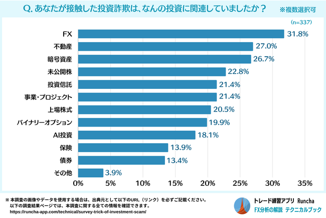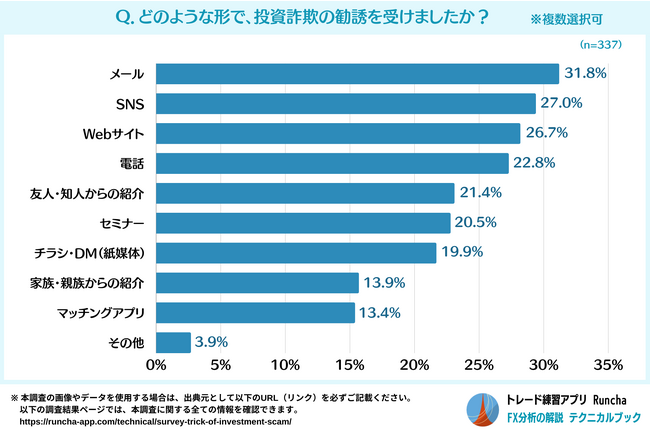 テクニカル分析専門サイト『テクニカルブック』は、投資詐欺の手口について調査する目的で、過去1年間に投資詐欺と接触経験のある20歳以上の男女337名を対象にアンケートを行いました。本調査からは、昨今の投資詐欺がどのように行われているのかが見えてきました。