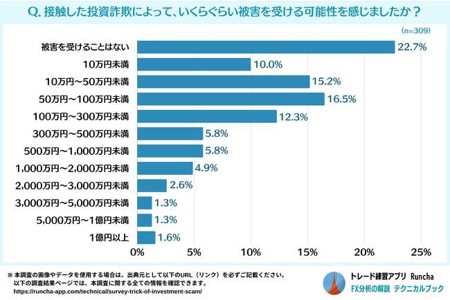 接触した投資詐欺に巻き込まれた場合の想定被害金額について質問したところ、最も高い割合は「被害を受けることはない」の22.7%でした。投資詐欺と接触したとしても、自分は引っかからないという自信を持った人が多いようです