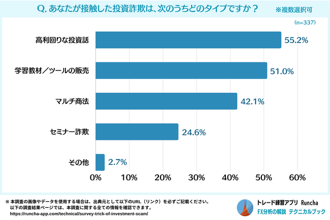 1.投資詐欺は「高利回りな投資話」を持ちかけられるケースが最も多く55.2%、2位は「学習教材/ツールの販売」で51.0%、3位は「マルチ商法」で42.1%