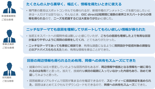 「OIC direct」は、Web検索をするような手軽さで社外のエキスパートに質問&回答が得られ、現場~経営層までそれぞれの立場で、新規事業開発を推進するために必要な情報収集にご活用いただけるサービスです。