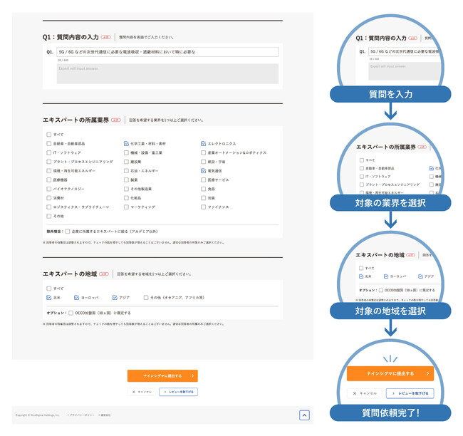 世界2万人の技術系エキスパートを対象に、地域・業界等を設定して質問可能