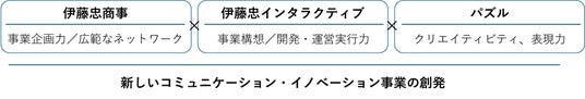 新たに伊藤忠インタラクティブは、クリエイティブ力と表現力の強みを獲得し、これまで自社の強みとしてきた、プランニング力/要件整理・策定力/プロジェクト構想・構築力に加え、パズルのクリエイティブ力、クオリティの高い表現力を得ることで、一気通貫で内製、完遂できる体制を構築し、これまで以上にイノベーティブな取り組みを推進いたします。