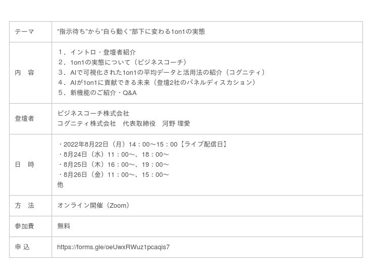 当社ではお客さまの事例紹介や、実際の1on1におけるトーク特徴の平均値データなど、ビジネス上のコミュニケーション力向上のための情報提供をするCOGWebinar(無料オンラインセミナー)を開催しています。