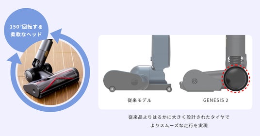 従来モデルより大きなタイヤと150°回転するヘッドにより、障害物が多い場所でもスムーズに操作できます。