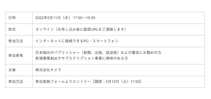 株式会社キメラ(英文社名:Ximera, Inc.、本社:東京都渋谷区、代表取締役社長:大東洋克)は、ウェビナー形式のオンラインイベント「XIMERA’s talk session~天狼院書店に学ぶ『生き残るためのイノベーション戦略』」を2022年5月11日(水)に開催します。