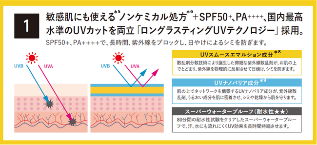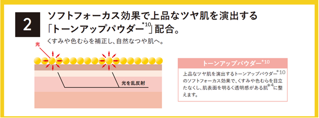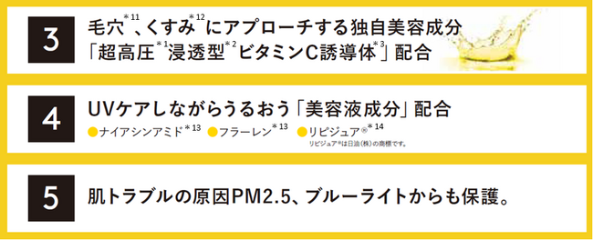 *1超高圧加工処理装置を用いた原料 *2角質層まで *3超高圧処理したテトラヘキシルデカン酸アスコルビル(保湿成分)*4メイクアップ効果による *5敏感肌の方によるパッチテスト済み(すべての方に皮膚刺激が起こらないというわけではありません) *6紫外線吸収剤無配合 *7気になる部分へ集中的に使用 *8酸化亜鉛、酸化チタン(紫外線散乱剤) *9セルロース(保湿成分) *10マイカ、酸化チタン(光沢剤) *11肌にうるおいを与え、乾燥により目立った毛穴を目立たなくすること *12乾燥してキメが乱れた肌 *13保湿成分 *14ポリクオタニウム-51(保湿成分)