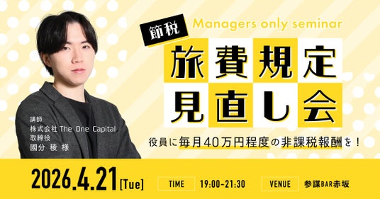 経営者コミュニティ「参謀」を運営する株式会社経営参謀(本社:東京都新宿区、代表取締役:新谷 健司)は、2026年4月21日(火)19時より、東京都港区赤坂のSHOT VILLAGE 赤坂店にて、旅費規定を活用した節税実践セミナー「【節税】役員に毎月40~60万円程度の非課税報酬を!改めて旅費規定を見直す会」を開催します。