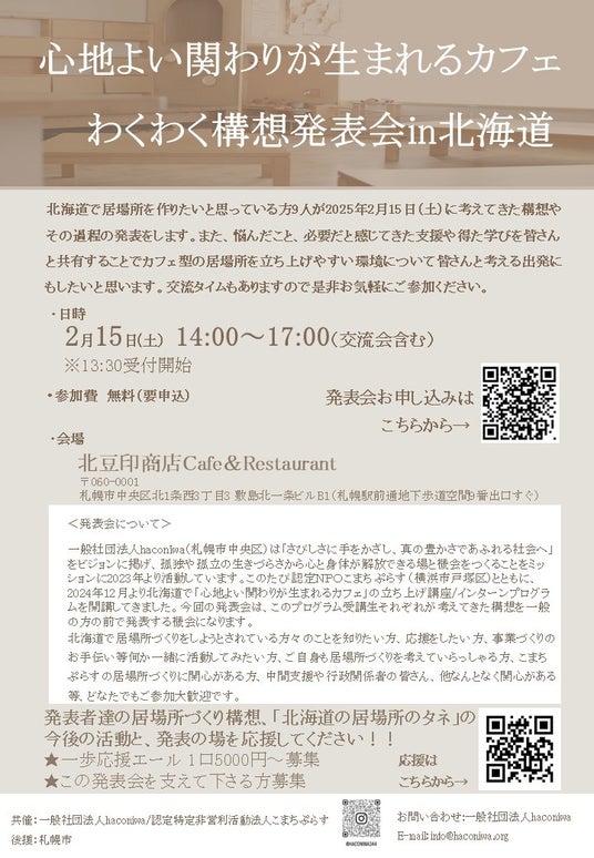 北海道にて居場所を作りたいと思っている方9名が2025年2月15日(土)に北海道札幌市にて、それぞれの構想の発表をします。