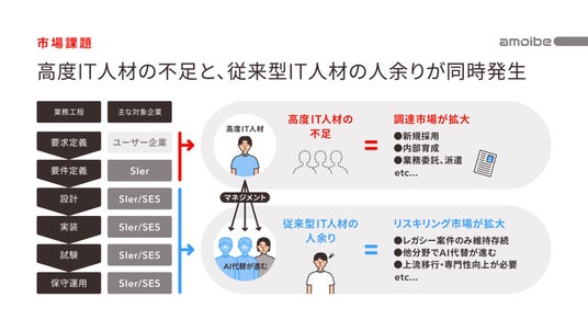 具体的には、高度IT人材の不足が深刻な課題となります。一方で、日本のエンジニアの多数を占める従来型IT人材は、一部のレガシー案件を除き、業務をAIに代替される危機があり、リスキリングが急務となります。