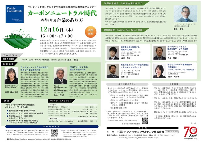 パシフィックコンサルタンツ株式会社は、創立70周年記念特別企画として、『カーボンニュートラル時代を生きる企業のあり方』ウェビナーを開催いたします。