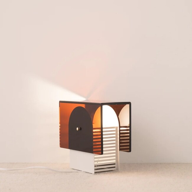 側面のルーバーやシェードの角度を変えることで生まれる光の陰影が質の高い空間を演出します。ベットサイドに置けば、就寝前の温かな灯りに。アクリル、スチール、真鍮の異素材の組み合わせによって、オブジェのような佇まいを醸し出します。