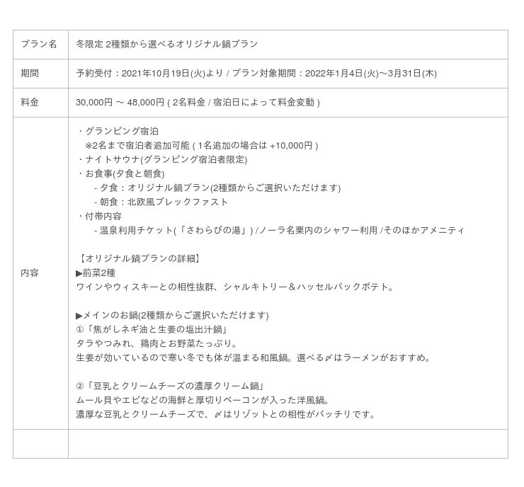 冬期限定 グランピングのオリジナル鍋プランの予約受付開始