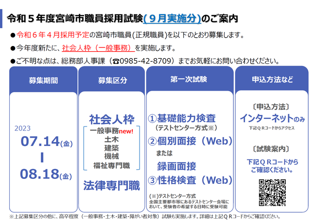 令和6年4月採用予定の宮崎市職員採用試験において、今年度から「社会人枠(一般事務)」の試験区分を新設しました。