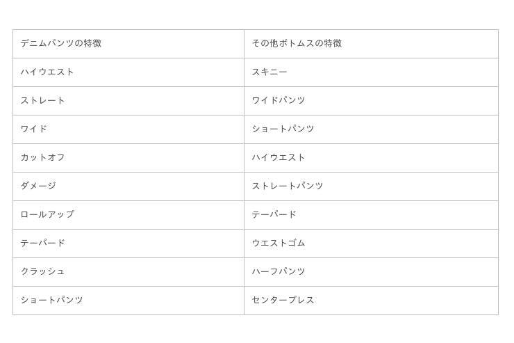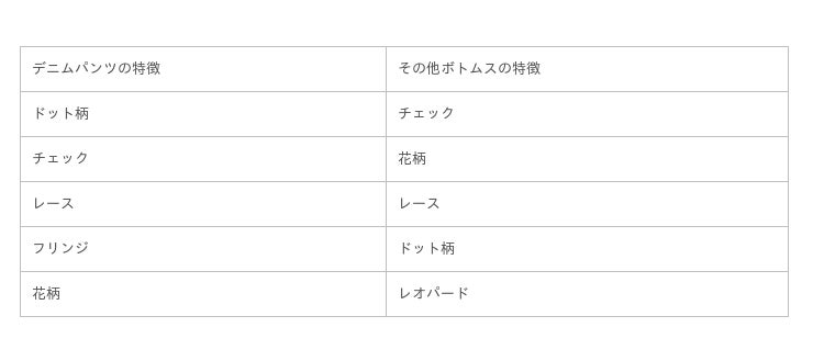 デニムとその他のボトムスで絞り込み、頻出していたタグ(特徴)を降順ソートで表示し、デザイン、カラー、柄/ディテールに仕分けしてその違いを比較しました。
