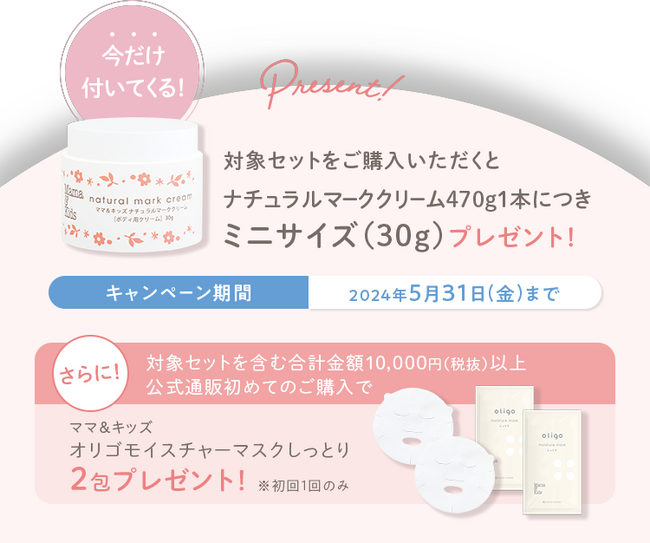 さらに、公式通販を初めてお使いの方は、対象セットを含む合計金額10,000円(税抜)以上のご購入で「ママ&キッズ オリゴモイスチャーマスク しっとり」を2包プレゼントいたします(初回に限る)。