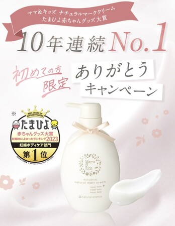 敏感肌スキンケアメーカー、株式会社ナチュラルサイエンス(所在地:東京都江東区、社長:小松令以子)では、「ママ&キッズ」シリーズの大人気妊娠ボディ用クリーム「ママ&キッズ ナチュラルマーククリーム」が妊活・妊娠・出産から子育て中のママ・パパを応援する情報メディア「たまひよ」の人気企画「たまひよ赤ちゃんグッズ大賞」※を10年連続で受賞したことを受け、2023年5月8日より、「10年連続No.1 ありがとうキャンペーン」を開催しております。