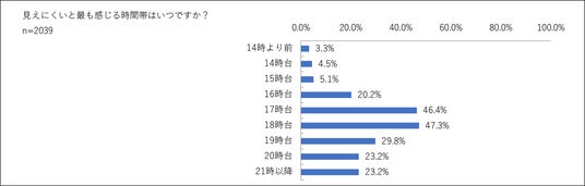 また、見えにくいと最も感じる時間帯は17時と18時で、夜の時間帯に入る19時以降は見えにくさが低減しています。