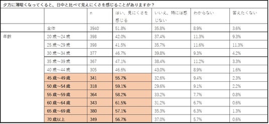 もっとも見えにくい時間帯は17時と18時 45歳以上の55%が見えにくさを感じている