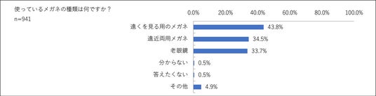 また、「夕方薄暗くなると見えにくさを感じる」という設問に「はい」と答えたメガネを使っている45歳以上を対象に、どのようなメガネを使用しているか調査したところ、遠近両用メガネが34.5%、老眼鏡が33.7%という結果でした。