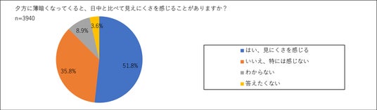 夕暮れ時は日中よりも見えにくさを感じることが多いのではないでしょうか。周囲が暗くなってきた、ということも理由ですが、実際に消費者はどのように感じているのか、20代~70代の男女3940人に調査を実施しました。