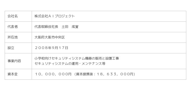 AIプロジェクトは、創業時より児童見守りサービスである「ツイタもん」事業を展開する業界のリーディングカンパニーです。機器の技術革新と他社には無い希望者へのICタグ無料配布サービスで競争力を創出し、近年急成長を続けております。子どもたちへのICタグの普及数は業界で全国NO.1の実績になります。防犯カメラを含む学校への設備導入の費用負担はありません。児童の登下校時刻は自動的に記録され、希望される保護者には有料のメール配信サービスを用意しています。そして今年の11月中には学校の行事情報などを確認できる機能を搭載したスマートフォン用の便利なアプリをリリースする予定です。有料でメール配信を受けている保護者はアプリ上でも登下校時刻を確認することができます。
