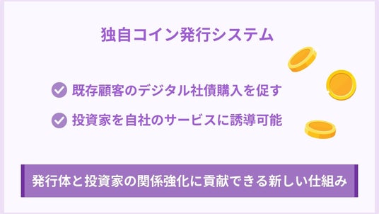 デジタル社債を購入した投資家に対する特典として、自社サービス等で使用できる独自コインを付与できます。