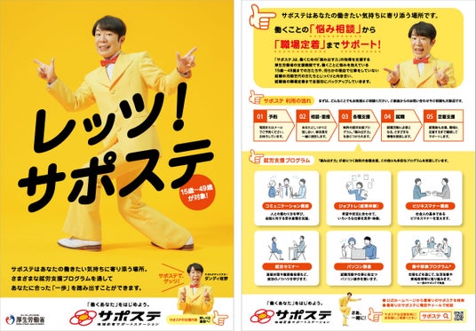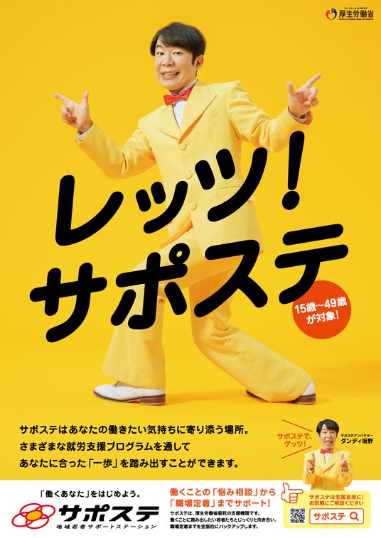 厚生労働省(所在:東京都千代田区)は、若年無業者等の就労支援を行う地域若者サポートステーション(以下「サポステ」という。)の広報活動の一環として、ダンディ坂野さんをサポステアンバサダーに起用した広報ポスター・チラシ・WEB動画を展開中です。
