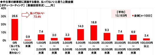 【ボディーコーティング】では、「払ってもいい」は73.4%、「0円(払ってもいいと思わない)」は26.6%となりました。払ってもいいと思う上限金額は「10,000円~20,000円未満」(18.8%)や「5,000円~10,000円未満」(14.0%)に回答が集まり、平均は13,163円でした。