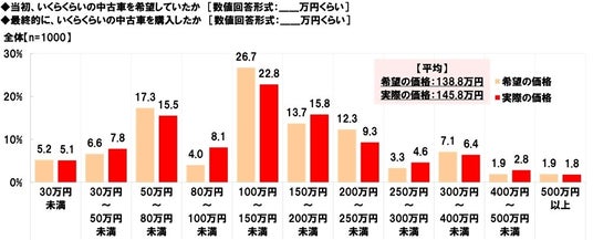 - 中古車の価格 当初の希望は平均138.8万円、最終的に購入したクルマは平均145.8万円