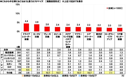 これから中古車におこなおうと思うカスタマイズを聞いたところ、「ドライブレコーダー装着」(4.4%)が最も高くなり、「カーナビ交換」(3.9%)、「ブレーキ交換」(2.6%)、「ホイール交換」「ステアリング交換・ステアリングカバー装着」「マフラー交換」(いずれも2.4%)が続きました。
