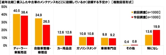 - 購入した中古車のメンテナンスの依頼先 TOP2は「ディーラー・車販売店」「自動車整備・修理店」