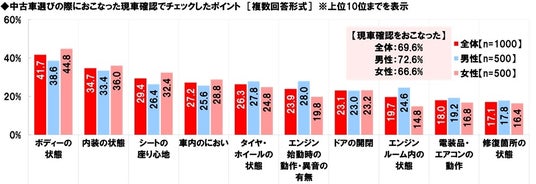 - 中古車選びの際におこなった現車確認でチェックしたポイント 1位「ボディーの状態」 2位「内装の状態」