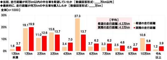 全回答者(1,000名)に、当初、走行距離が何万km以内の中古車を希望していたか聞いたところ、「5万km」(27.3%)に最も多くの回答が集まり、平均は4.3万kmでした。