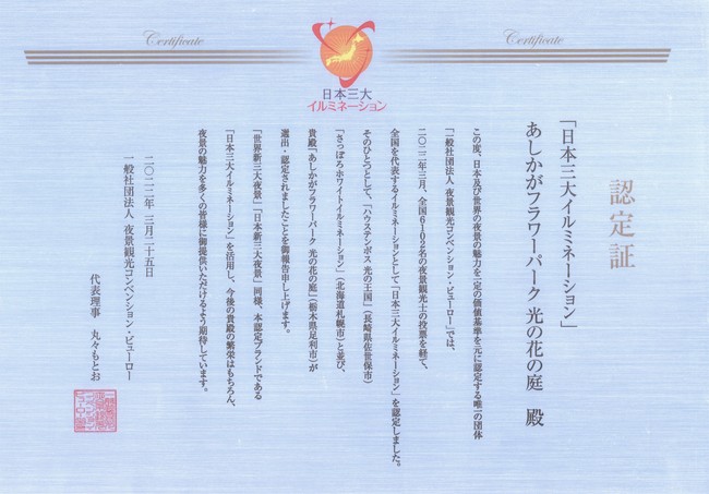 (株)足利フラワーリゾート(本社 栃木県足利市田中町906-13 代表 早川公一郎)が運営を行う、あしかがフラワーパークは2022年3月25日(金)、北海道札幌市・札幌芸術文化劇場hitaruで開催された『夜景サミット2022 in 札幌』において2017年に誕生した『日本三大イルミネーション』に再認定されました。