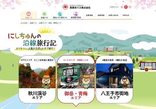 西東京バス株式会社(本社:東京都八王子市、代表取締役社長:浜田丈夫)では、2025年3月28日(金)にホームページにて、弊社マスコットキャラクターの「にしちゅん」が西東京バス沿線エリアの人気スポットを紹介する『にしちゅんの沿線旅行記』の掲載を開始します。