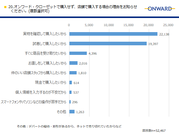 当社が提供するメンバーシッププログラムであるオンワードメンバーズの会員(回答者 31,900名、回答数 52,467件)に実施したアンケートによると、「オンワード・クローゼットで購入せず、店頭で購入する理由は?」という質問に対して、22,138名(42.2%)が「実物を確認して購入したいから」、19,397名(37.0%)が「試着して購入したいから」という回答が得られました。