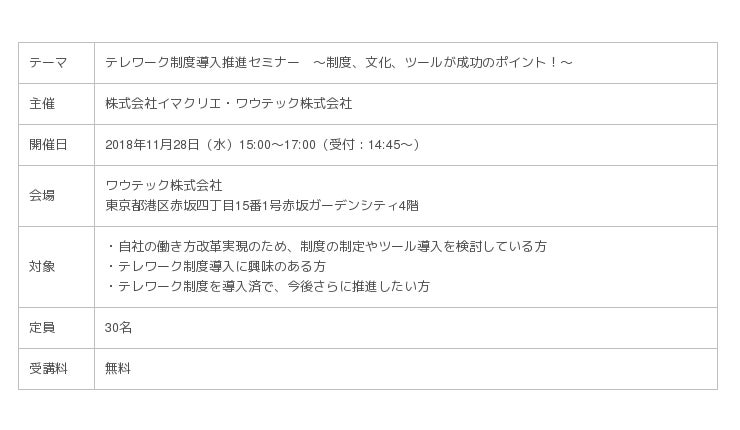 2018年11月28日(水)、利用社数3,000社超のビジネスチャット・社内SNS「WowTalk(ワウトーク)」を提供するワウテック株式会社(東京都港区、代表取締役 瀬沼悠、以下、「ワウテック」)は、テレワーク支援事業を展開する株式会社イマクリエ(以下、「イマクリエ」)とともに、「テレワーク制度の導入推進」をテーマに、成功のポイントである「制度・文化・ツール」についてわかりやすく解説する共催セミナーを開催いたします。