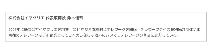 イマクリエが提供するテレワーク導入支援の知見やエヴァンジェリスト西村氏の複業研究家としての知見、ビジネスチャットを活用したテレワーク制度成功の秘訣などをお話いたします。