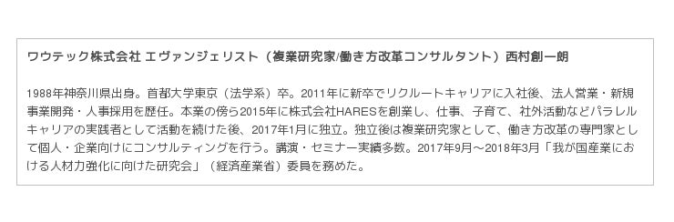 そこで今回、「"新しい働き方を通して日本、世界に、イノベーションを起こす"」というビジョンを掲げるイマクリエと当社のエヴァンジェリストである複業研究家/働き方改革コンサルタントの西村創一朗氏と共催セミナーを開催するにいたりました。