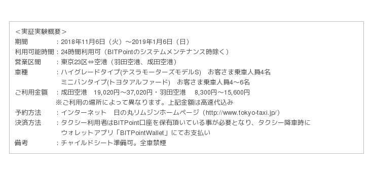 株式会社リミックスポイント(証券コード:3825、本社:東京都港区六本木三丁目2番1号、代表取締役会長 小田玄紀)の子会社である株式会社ビットポイントジャパン(以下「BITPoint」)は、「腕よりも心で運転」をキャッチフレーズとする株式会社日の丸リムジン(本社:東京都文京区後楽1-1-5、代表取締役社長 富田和宏 以下、「日の丸リムジン」)との間で仮想通貨による決済サービス展開に関する業務提携について合意し、2018年11月6日より空港送迎タクシーサービスにて仮想通貨による決済の実証実験を開始することをお知らせいたします。