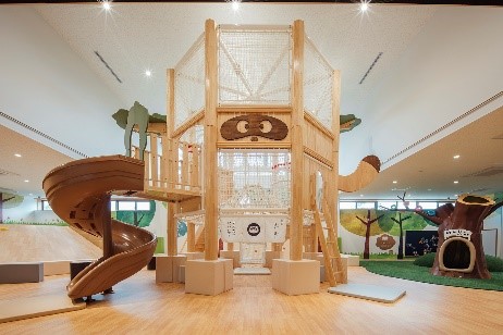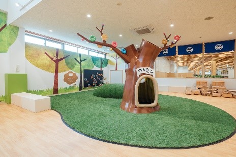 施設内には子ども達が天候に左右されることなく沢山遊ぶことができる、「こどもひろば」が誕生。木をふんだんに使った温かみのある広場の暖簾をくぐると、東広島市公認のマスコットキャラクター“のん太”のアスレチックがお出迎えします。畳スペースや木製遊具、読書スペースなどもあり、0歳から小学校4年生までを対象に遊ばせることができます。さらにはフードコート、レストラン、通路と三方向から見守り可能で、親子が安心・快適・自由に過ごすことができる目的地になる道の駅を目指しています。