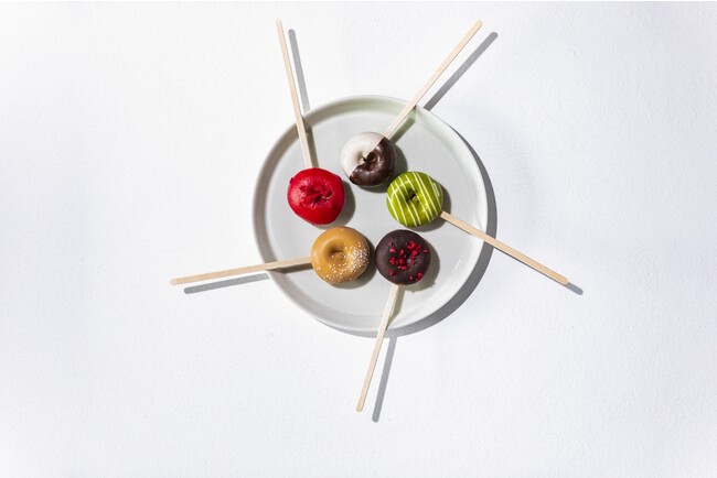 ROOTH ドーナツはニューヨークで着想を得て開発した直径 5 cmのドーナツ。生地にヨーグルトを入れ、甘さひかえめ。カラフルなソースコーティングは手作りでひとつひとつ仕上げています。