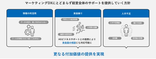 当社はこれまで中小企業を中心としたマーケティングDXを推進することを目標としていました。ですが、顧客となる中小企業は情報の利活用、資金繰りや人手不足など幅広い悩みを抱えていることが多く、そういった悩みを持つ中小企業の経営全体をサポートするような取り組みが必要であると認識しております。AGビジネスサポートの提供する「事業者向けローン」は、資金繰りに悩んでいる中小企業向けのファイナンス支援として適切なサービスであり、当社が取次業務を行うことにより、顧客へ更なる付加価値を提供できると考えております。