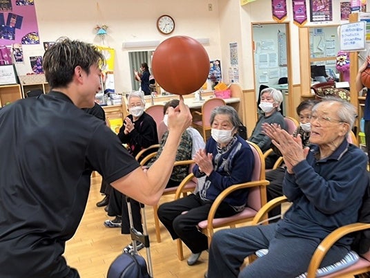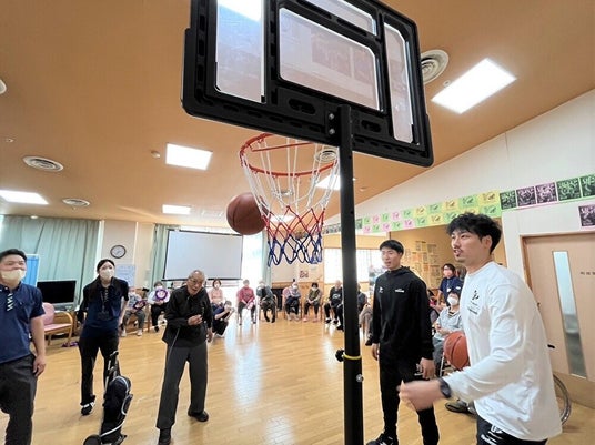 「郡山ケアセンターそよ風」施設内での交流イベント。「福島ファイヤーボンズ」現役選手のコーチングでバスケットボールのシュートにチャレンジし見事ゴールを決めるお客さま