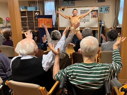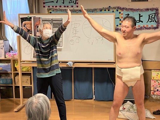 「三河島ケアセンターそよ風」施設内での元幕内力士・岩戸氏との相撲イベントでのワンシーン