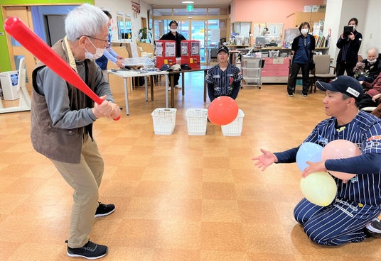 4年目の「イマドキシニア」プロジェクトのスポーツ協業による「小倉南ケアセンターそよ風」のお客さまと、プロ野球独立球団「北九州下関フェニックス」選手との交流イベントでのワンシーン
