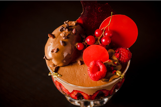 まず一口目に召し上がっていただきたいのは、グラスにしき詰められた濃厚なチョコレートクリーム。希少性の高い、フェアトレード認証を得ているオーガニックチョコレートを贅沢に使用し、口溶けなめらかに仕上げました。チョコレート菓子の王道、「フォンダン・オ・ショコラ」をパフェに“リメイク”するというコンセプトで制作した、このパフェの主役を担っています。そのチョコレートクリームを食べ進むと、フランボワーズの甘酸っぱさを強調したジュレと、マイルドに調整したクリームの 2 層に出会います。濃厚なチョコレートのコクに、相性のいいフランボワーズの酸味が重なることで、一口目よりもさっぱりとしたクセになる味わいを演出します。 2 層仕立てのフランボワーズジュレ・クリームの下には、オレンジ酒を染み込ませたサクサクのアーモンド生地とザクザク食感のグランブルカカオ、フランボワーズの果実が。パフェのトップには赤く色つけたパリパリとした食感の繊細なチョコレートチュイール、酸味の強いグロゼイユと甘酸っぱいフランボワーズ、そして口溶けなめらかなチョコレートクリームとビターテイストのチョコレートアイスが据えられ、ショコラホリックを最後まで飽きさせない、シェフの自信作となっています。